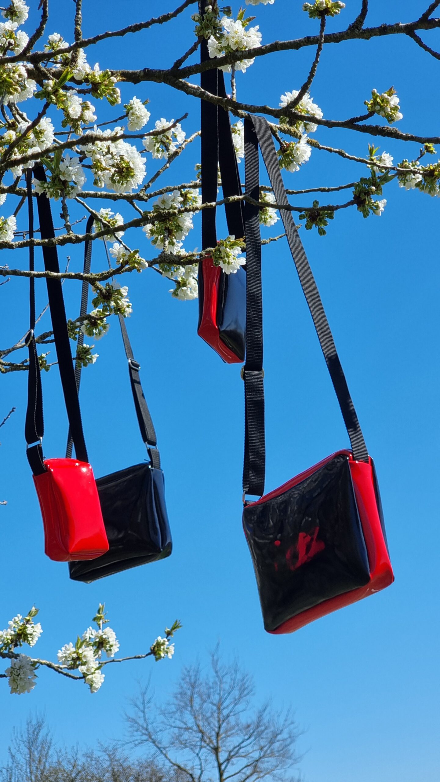 Large and small bags in any combination of red, black and silver front, back and sides with adjustable strap and zipper.